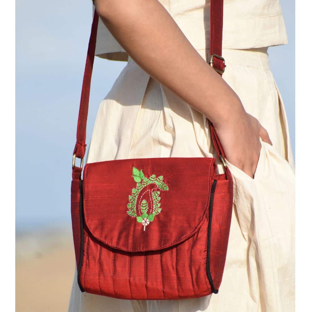 Upgrade your style with this exquisite hand-embroidered sling purse, crafted from luxurious cotton silk. The intricate hand embroidery and adjustable strap make it a versatile accessory for any occasion. This bestseller is a testament to our artisans' skill and attention to detail.