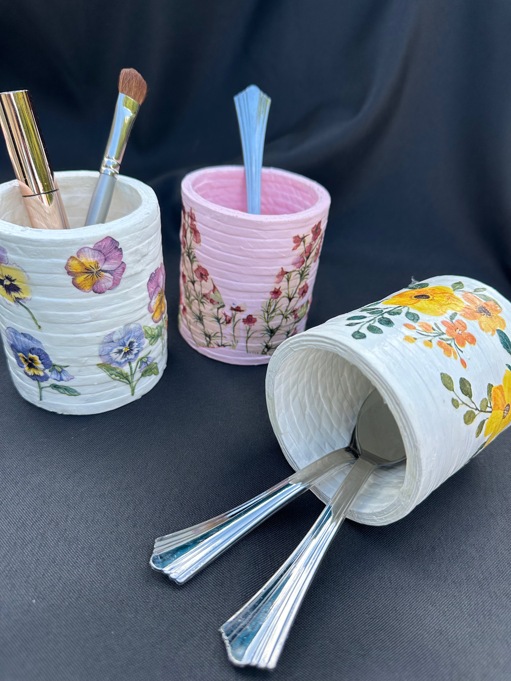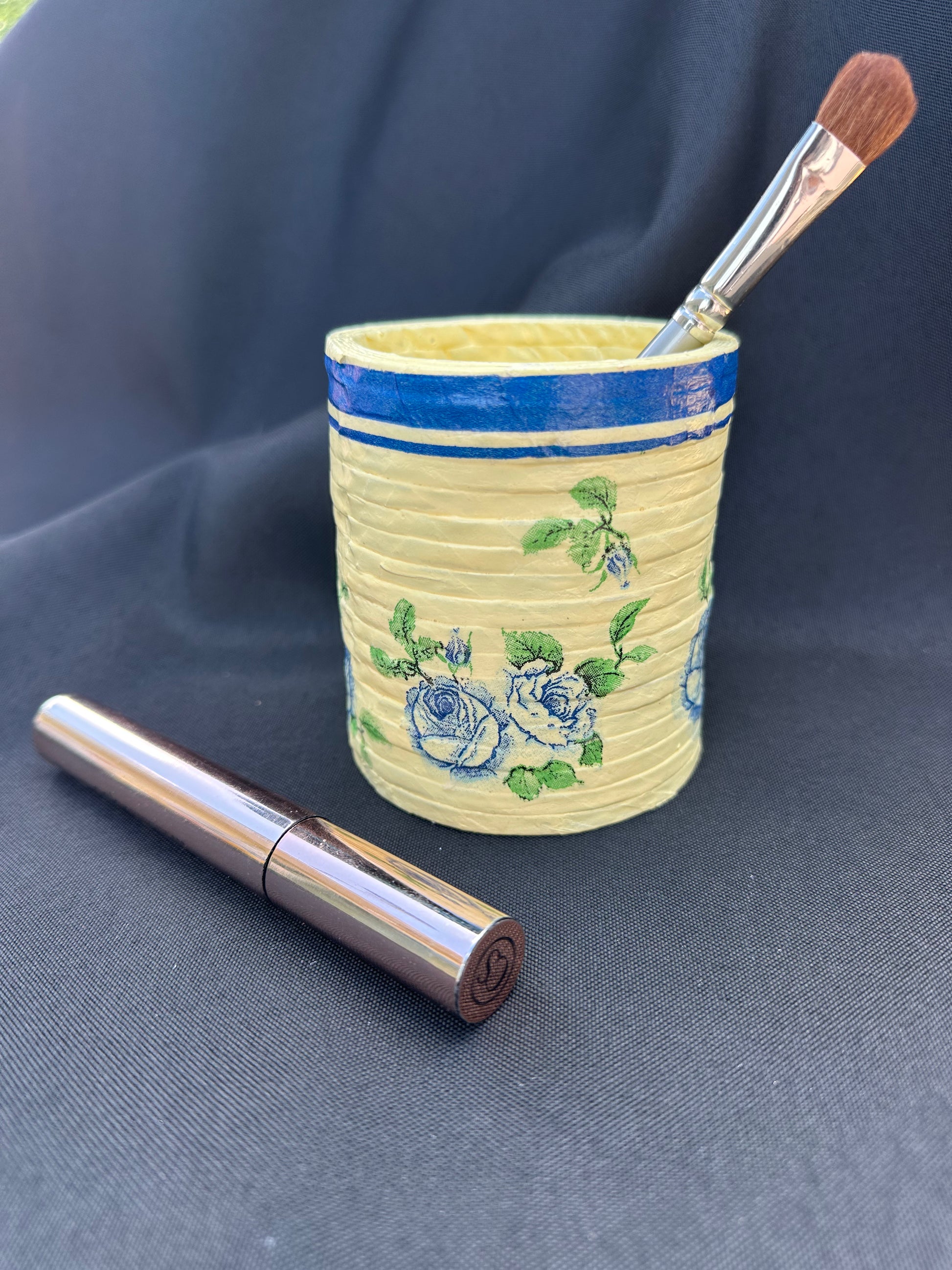 Old newspapers find new life in the form of a round decorative brush/pencil/cutlery stand, beautifully adorned with summery floral decoupage. Lovingly crafted by our skilled mothers of special children from Virar School in Mumbai, India. They turn waste into wonder, one paper reed at a time, creating sustainable, charming, and functional lifestyle products.